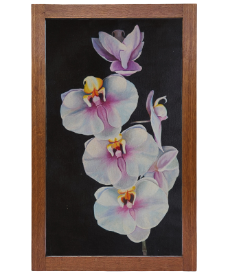 A graceful cascade of orchids blooms against black silence, capturing nature’s quiet drama in mineral hues.