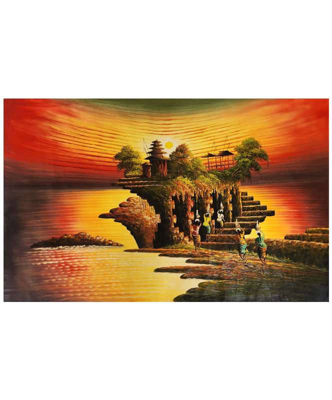 A coastal temple glows beneath a fiery sunset, where nature and devotion meet in radiant harmony.