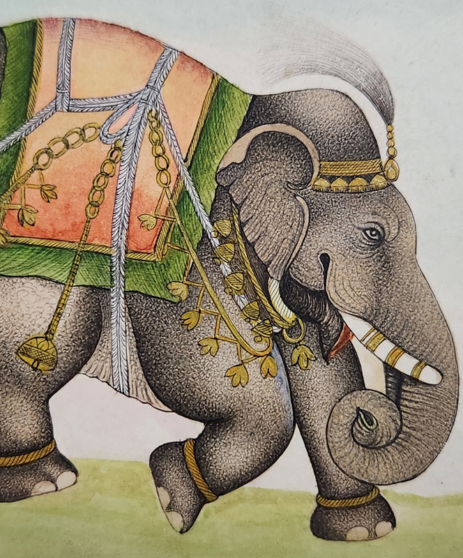 This traditional Indian miniature painting depicts a richly adorned elephant in profile, walking gracefully as part of a ceremonial procession.