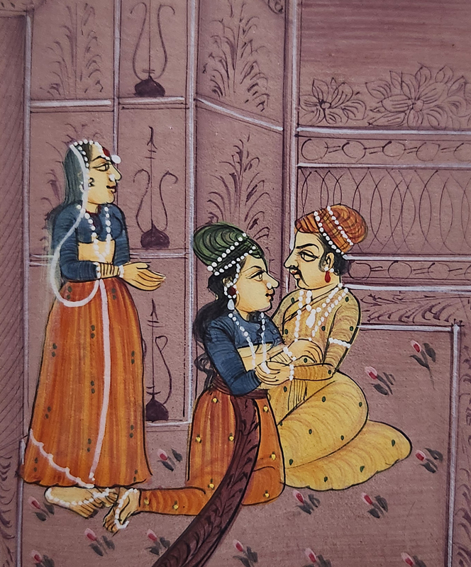This stunning miniature painting captures a vibrant royal court scene, showcasing three elegant figures engaged in a moment of discussion.