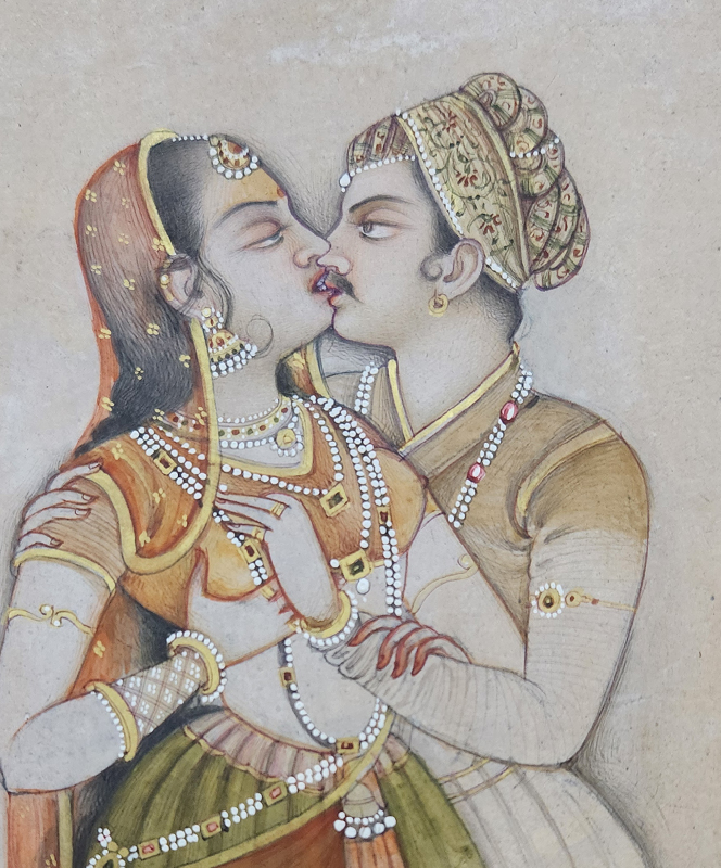 This exquisite miniature painting portrays a royal couple in an intimate moment, symbolizing love, elegance, and cultural richness.