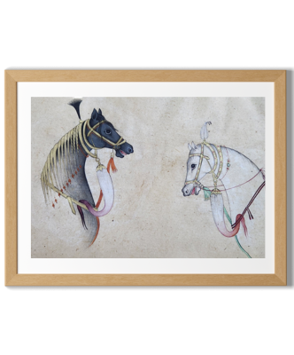 A delicate miniature painting depicting two elegantly adorned horses facing each other.