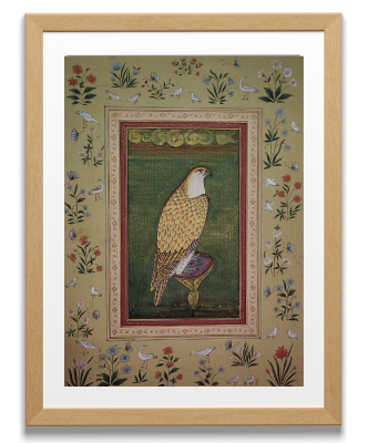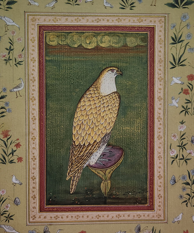 A detailed miniature painting depicting a regal falcon perched on a stand, surrounded by intricate floral and avian motifs.
