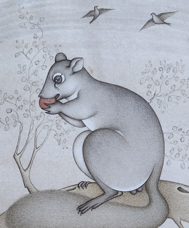 A detailed miniature painting of a rodent sitting on a rock with birds flying in the background.