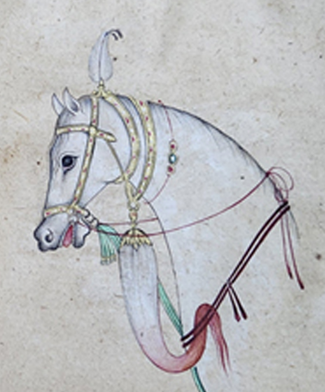 A detailed miniature painting of a horse adorned with intricate harness and decorative elements.