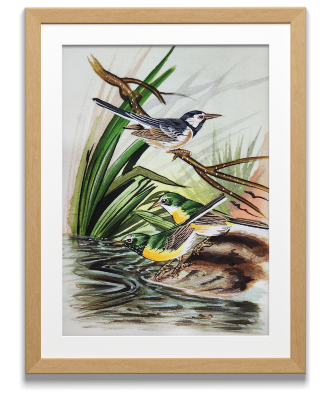 A tranquil scene of three colorful birds by a stream, surrounded by lush greenery.