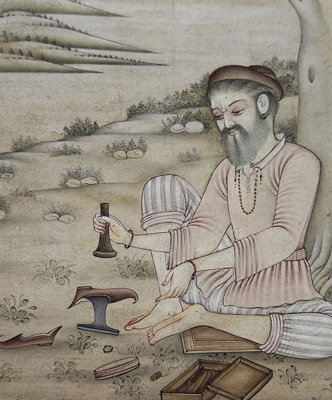 A detailed miniature painting depicting an artisan engaged in his craft under a tree.
