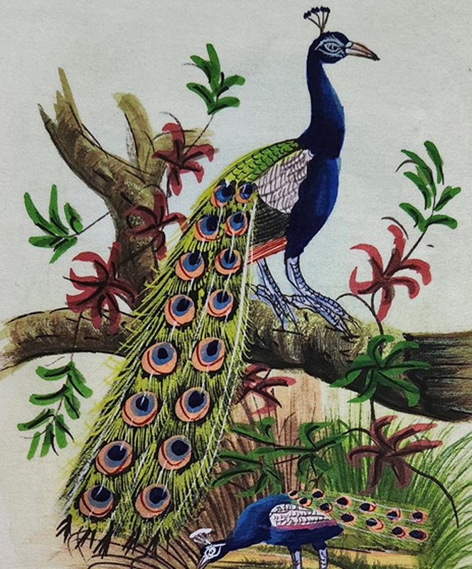 A vibrant water painting depicting two peacocks amidst lush greenery and blooming flowers.