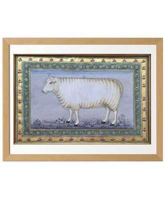A detailed painting of a cow standing in a grassy field, framed by an ornate border.