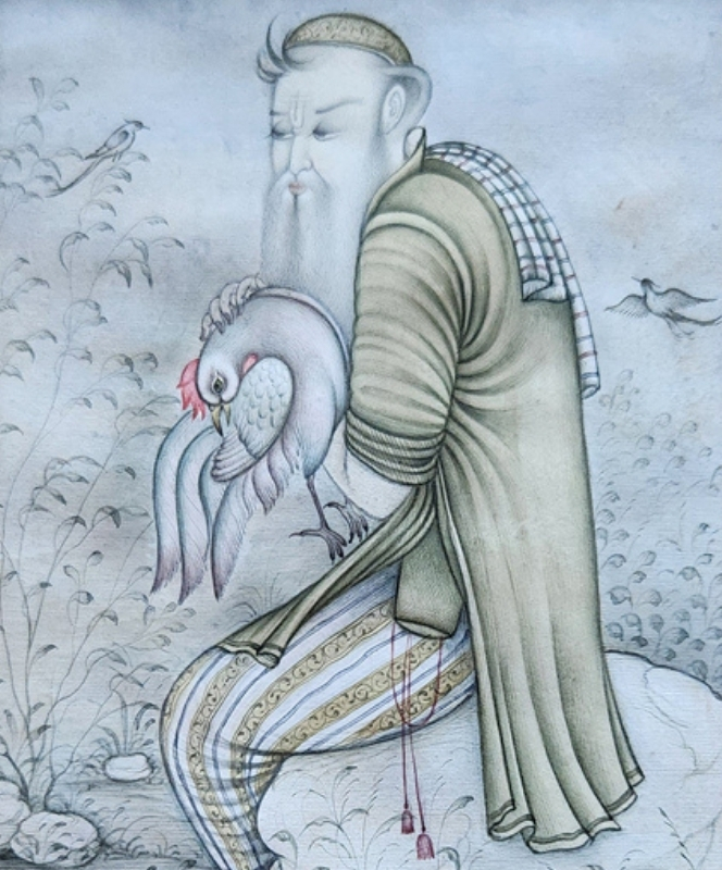 A detailed Indian miniature painting depicting an ascetic holding a bowl and staff, surrounded by nature.