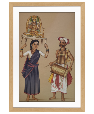 A vibrant watercolor painting depicting a traditional Indian procession with a woman carrying a deity and a man playing a drum.