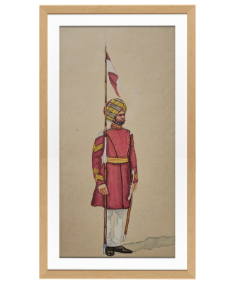 A detailed watercolor painting depicting a traditional guard in ceremonial attire.