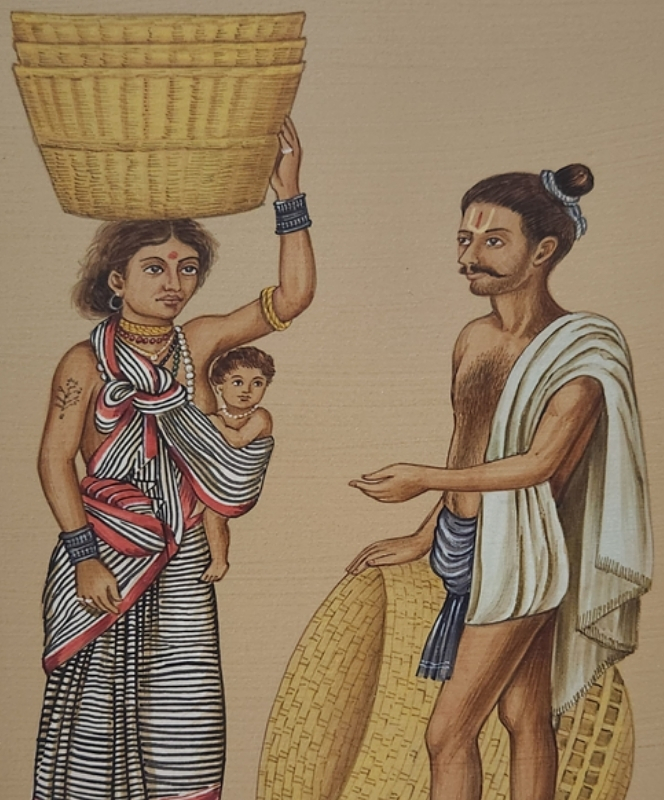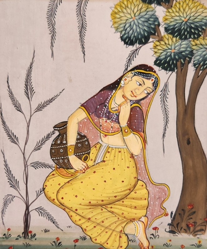 A traditional Indian miniature painting depicting a lady in vibrant attire holding a pot under a tree.