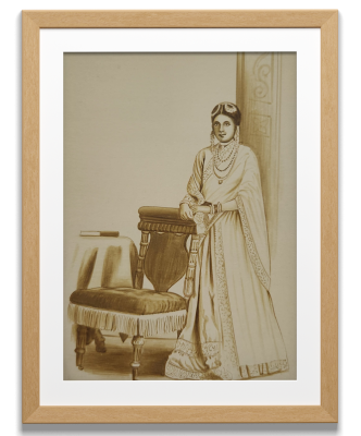 A sepia-toned watercolor painting depicting a regal figure in traditional attire, standing beside an ornate chair.