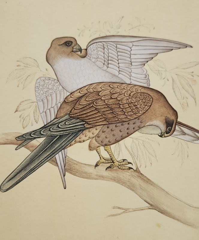 A detailed miniature painting depicting two falcons perched on a branch, showcasing intricate feather patterns and naturalistic poses.