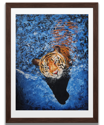 A captivating abstract painting of a tiger swimming through vibrant blue waters.