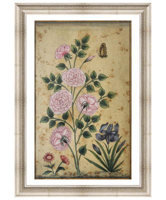 A delicate miniature painting depicting a blooming floral arrangement with a butterfly, showcasing intricate details and vibrant colors.