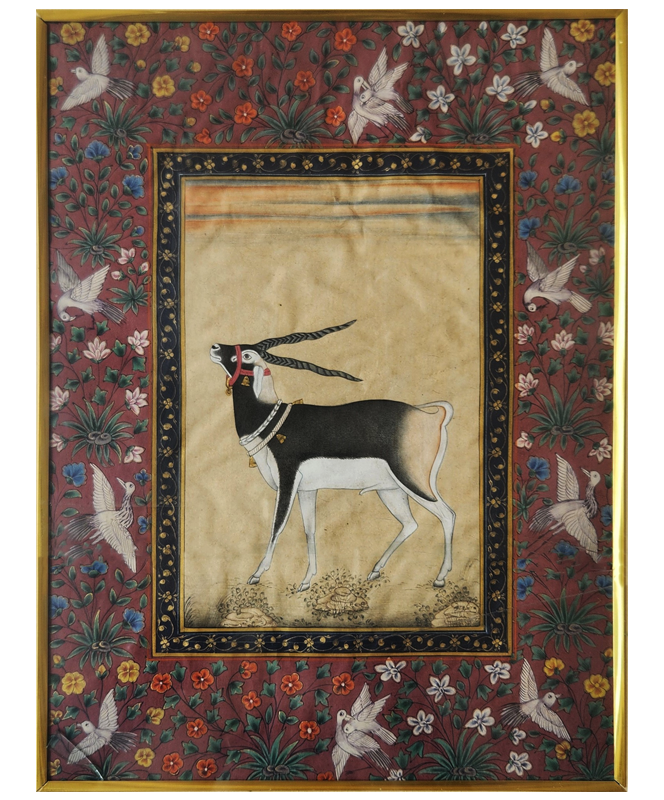 A detailed miniature painting of a blackbuck adorned with jewelry, set against a vibrant floral background.