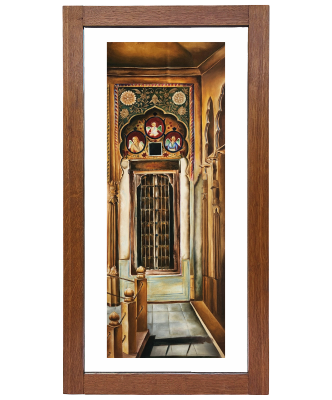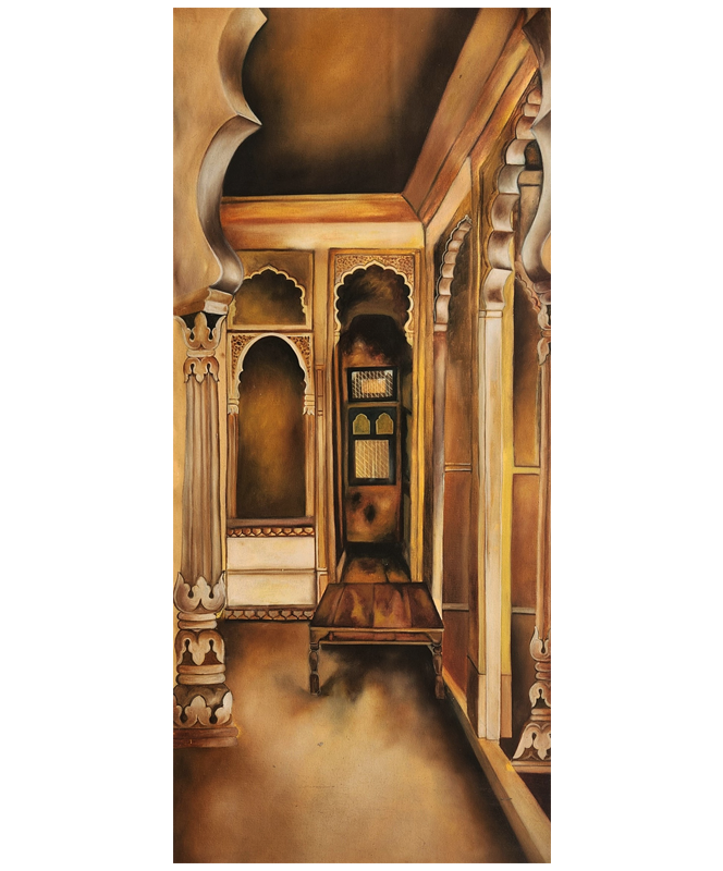 A captivating oil painting of a traditional corridor framed by ornate arches and columns, rendered in original mineral pigments.