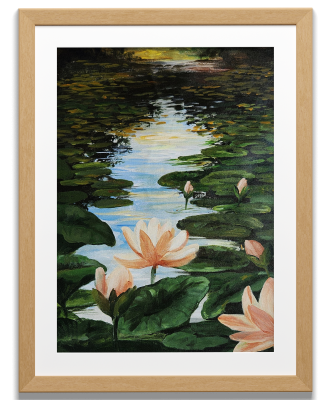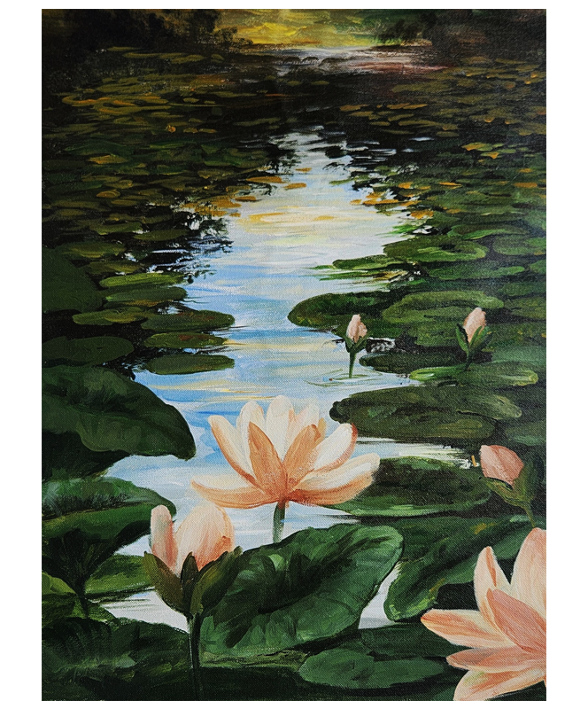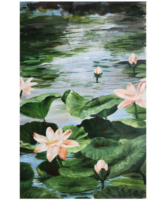 A tranquil oil painting of blooming water lilies floating on a serene pond, rendered in original mineral pigments.