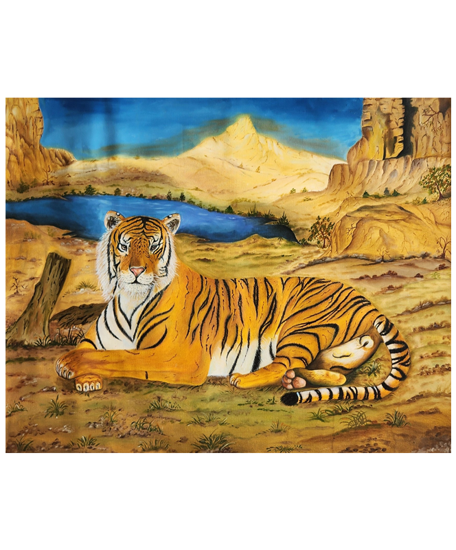 A majestic oil painting of a tiger resting in its natural habitat, rendered in original mineral pigments with lifelike detail and serene atmosphere.