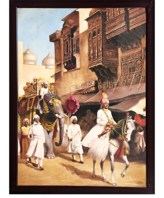 An intricate oil painting depicting a traditional Indian balcony with ornate architectural details.