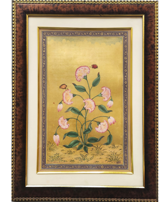 A Mughal miniature painting depicting delicate pink flowers and butterflies on a golden background.