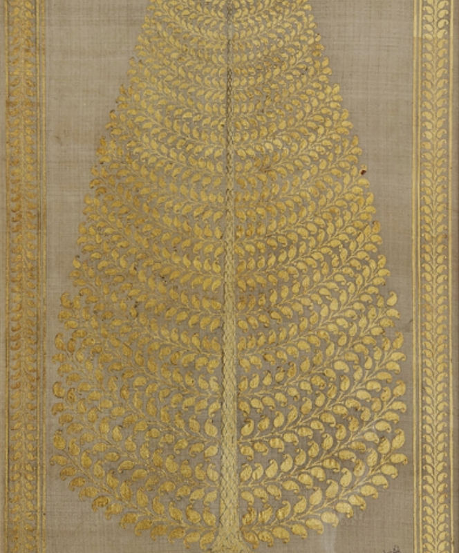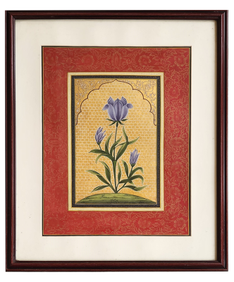 A Mughal-style miniature painting featuring a delicate floral motif framed by intricate geometric patterns.