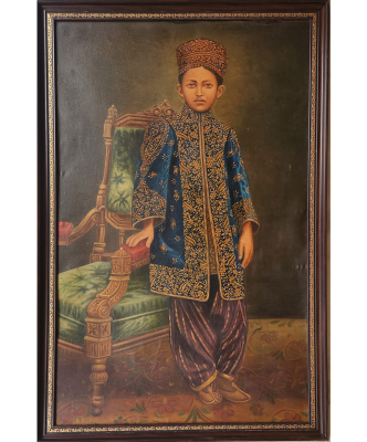 A detailed oil painting of a young person in ornate traditional clothing, standing beside an intricately designed chair.