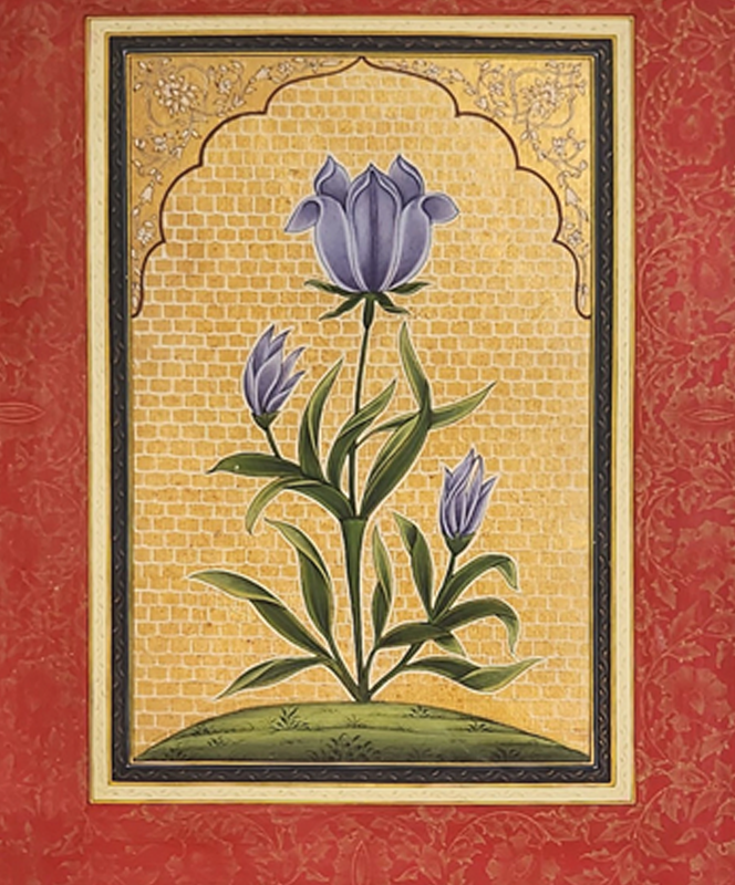 A beautifully framed miniature painting depicting a vibrant blue tulip with intricate detailing and a rich background.