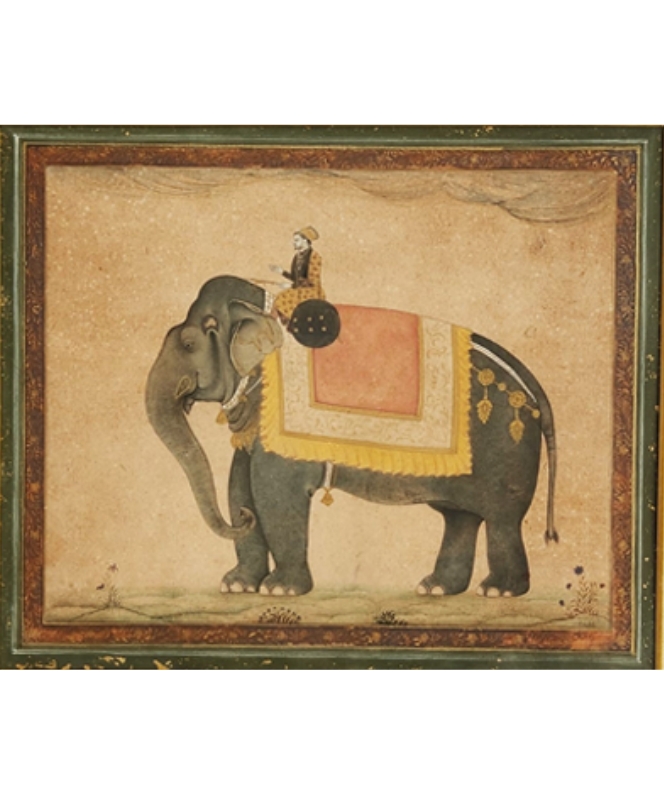 A traditional Indian miniature painting depicting a royal elephant adorned with a richly decorated saddle and a mahout.