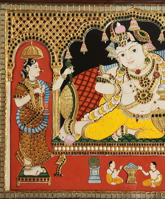 A Tanjore painting depicting Lord Krishna in a relaxed, royal pose surrounded by attendants.