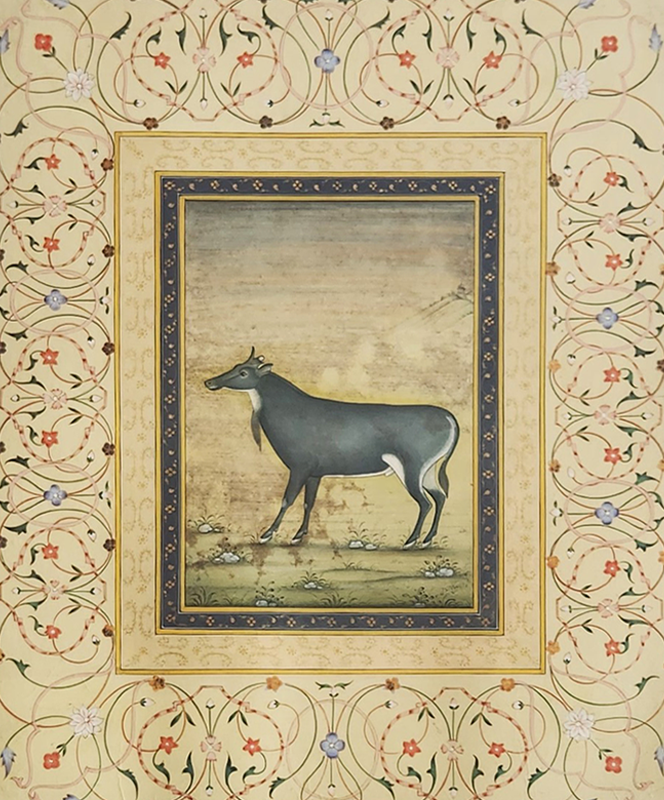 A Mughal miniature painting depicting a Nilgai, framed with intricate floral patterns