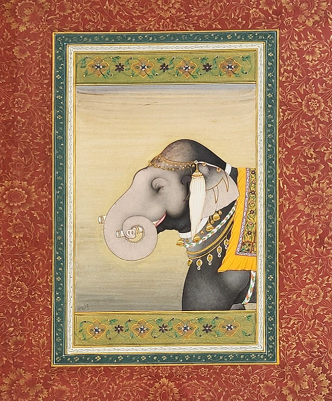 A detailed miniature painting of an adorned elephant in traditional attire, framed with intricate borders.