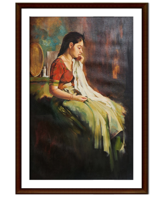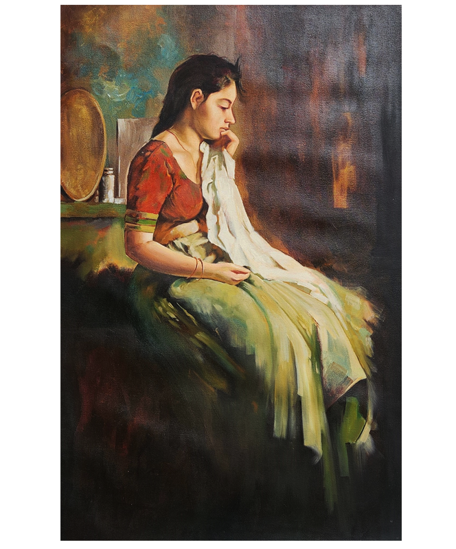 A contemplative oil painting of a woman seated in traditional attire, lost in quiet introspection, rendered in original mineral pigments.