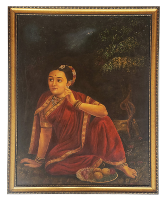 A captivating oil painting of a lady seated gracefully, adorned in a saree and traditional jewellery, exuding timeless beauty.