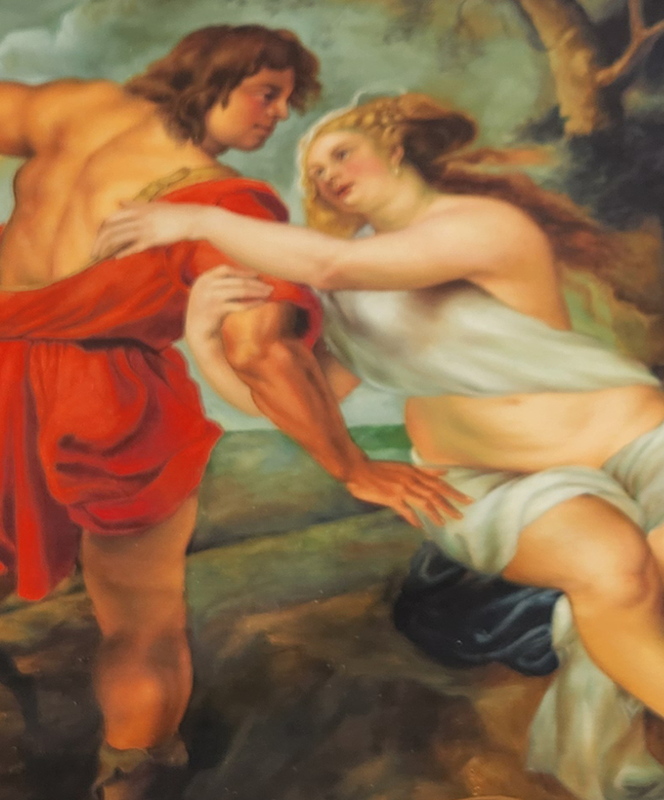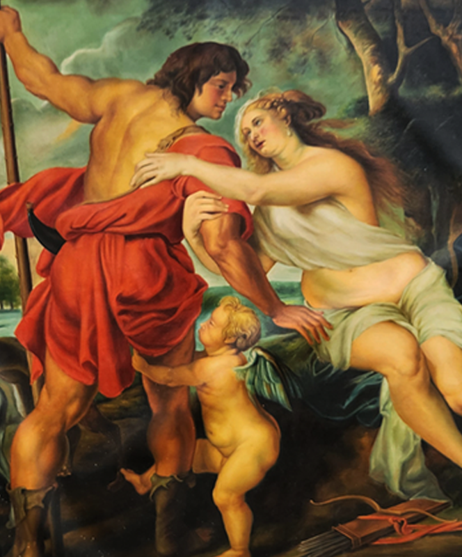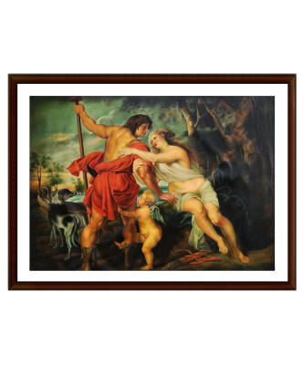 A masterful recreation of Rubens' Venus and Adonis, capturing the passionate and tragic mythological tale in vivid oil colors.