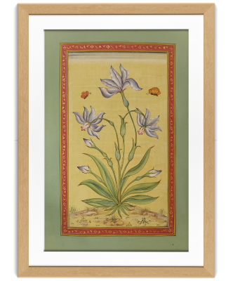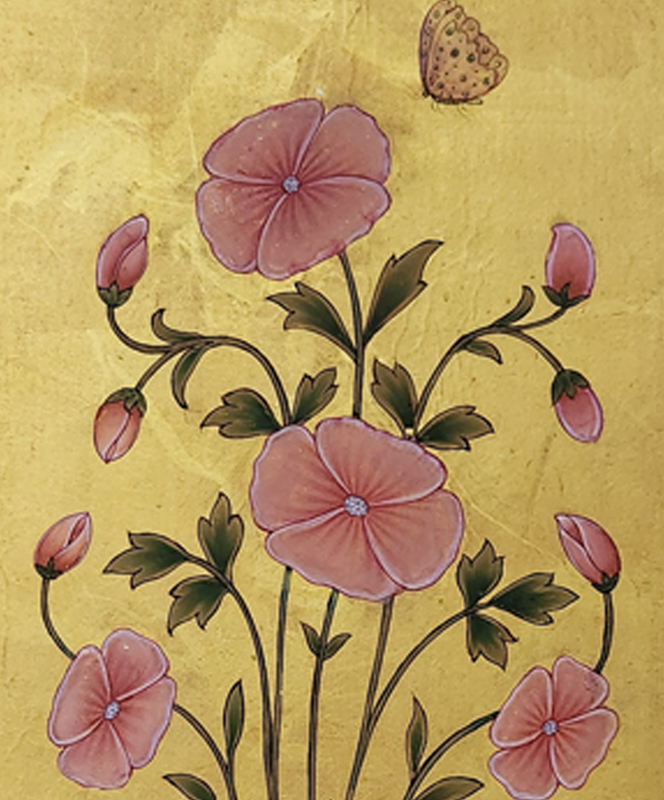 A captivating Mughal miniature painting featuring a delicate flowering plant with butterflies, embodying the grace and finesse of traditional Indian art