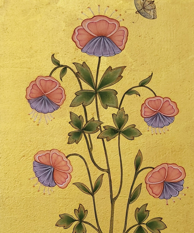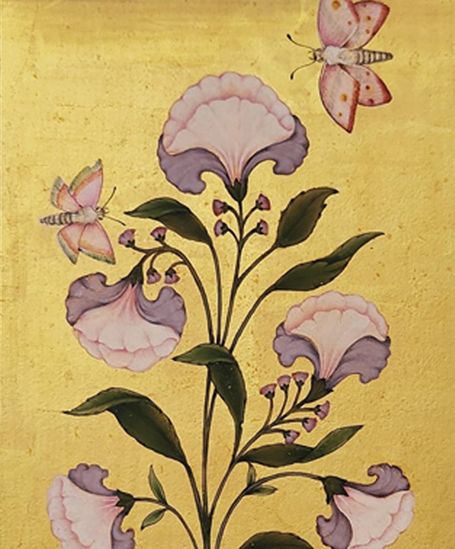 A Mughal miniature painting depicting a delicate flowering plant with butterflies, embodying the grace and intricacy of traditional Indian artistry.