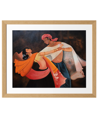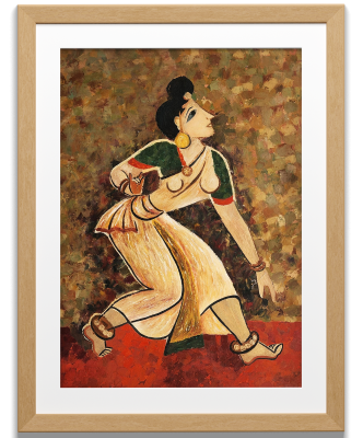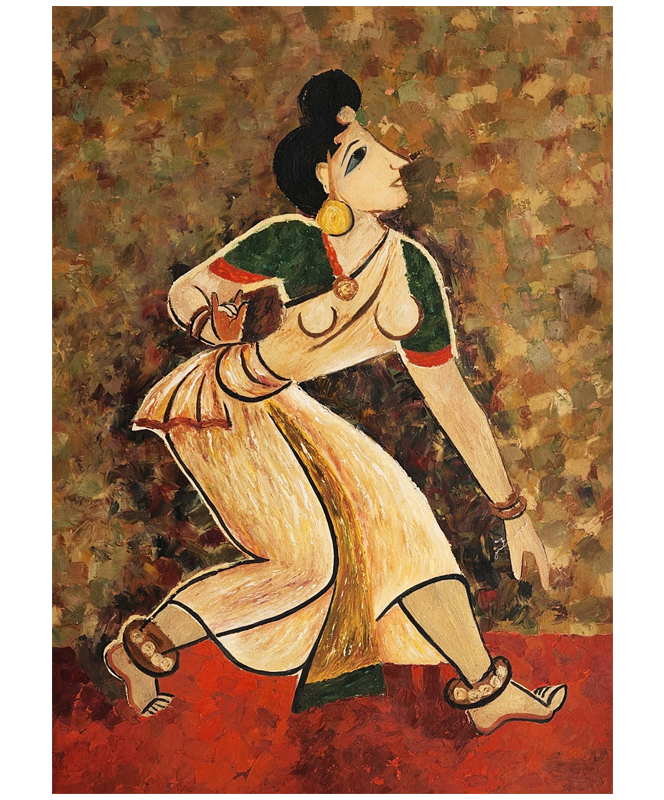 A dynamic portrayal of a traditionally adorned dancer captured mid-movement, rendered in bold strokes and original mineral colors.