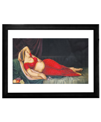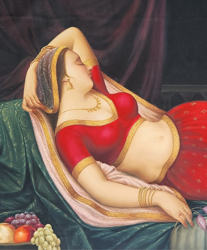 A regal portrayal of a woman in repose, adorned in traditional attire and painted with original mineral colors.