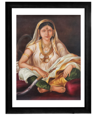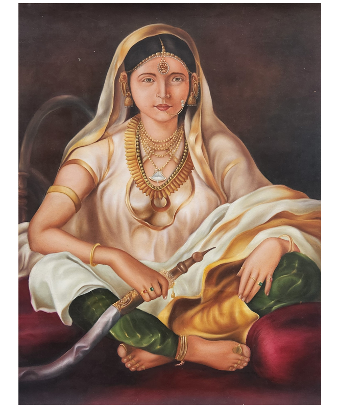 A regal oil portrait of a traditionally adorned woman, painted with original mineral colors on canvas.