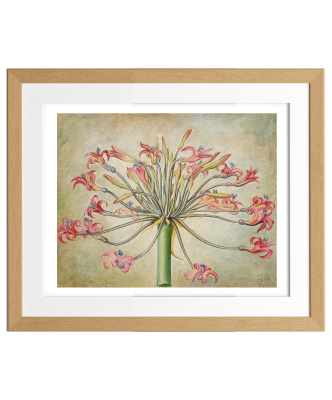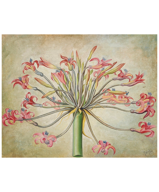 A botanical bloom unfurls in rhythmic symmetry, where pink petals dance around a verdant stem on a canvas of quiet beige.