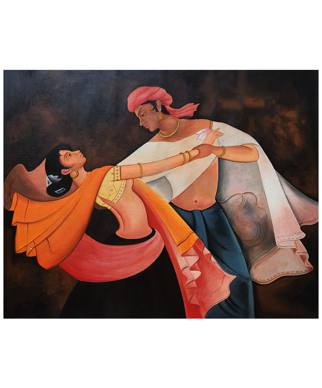 A hand-painted silk artwork capturing a dynamic moment of classical Indian dance between two elegantly adorned figures