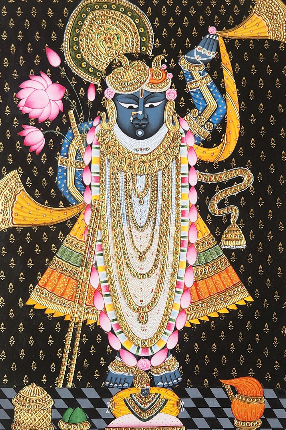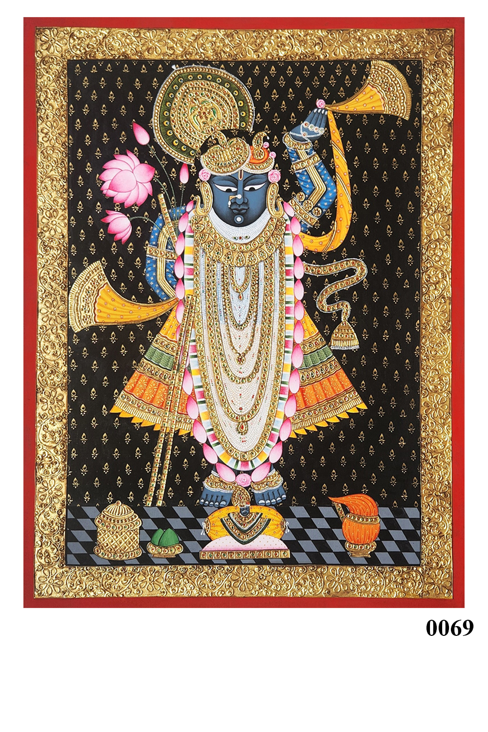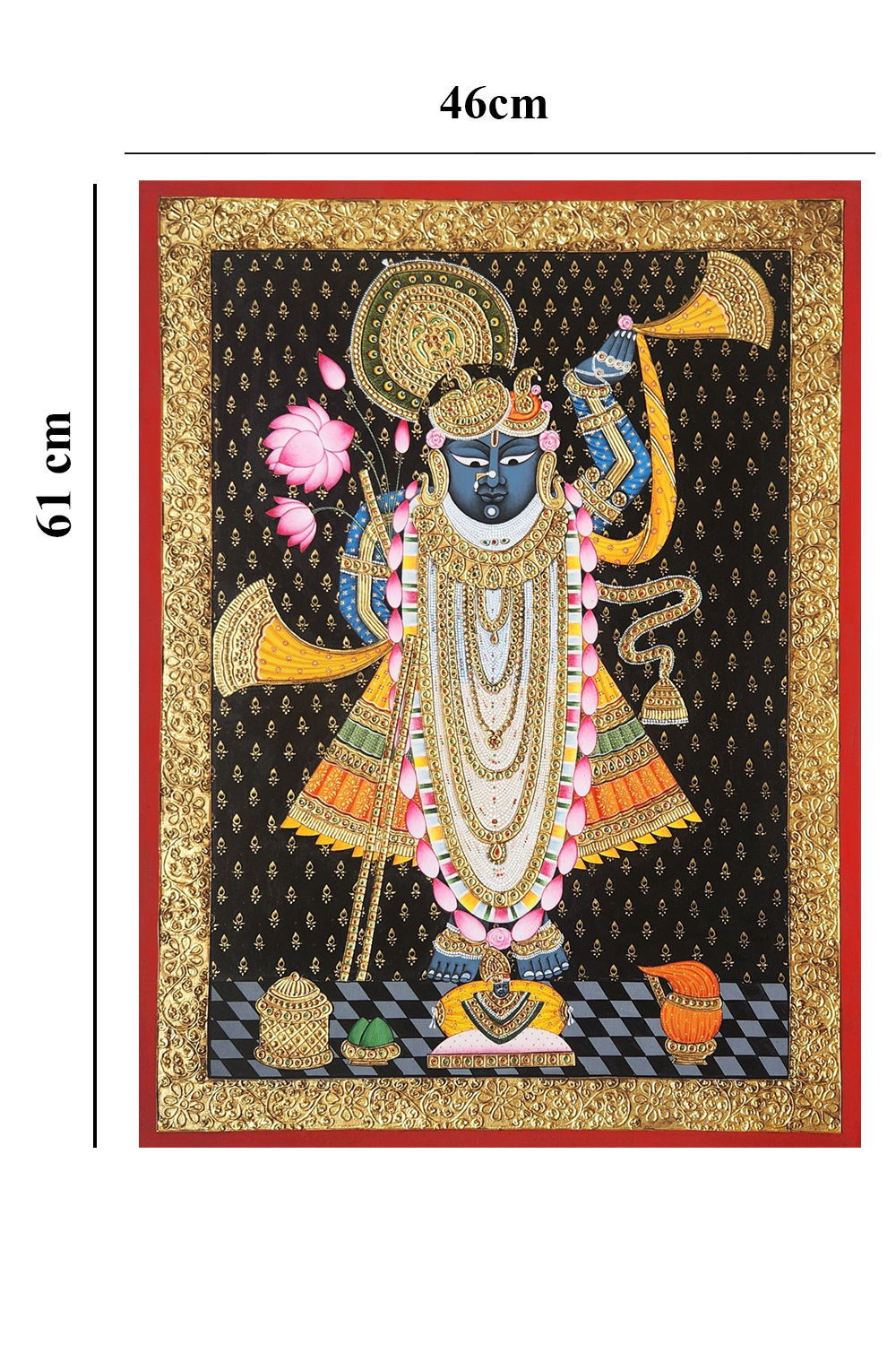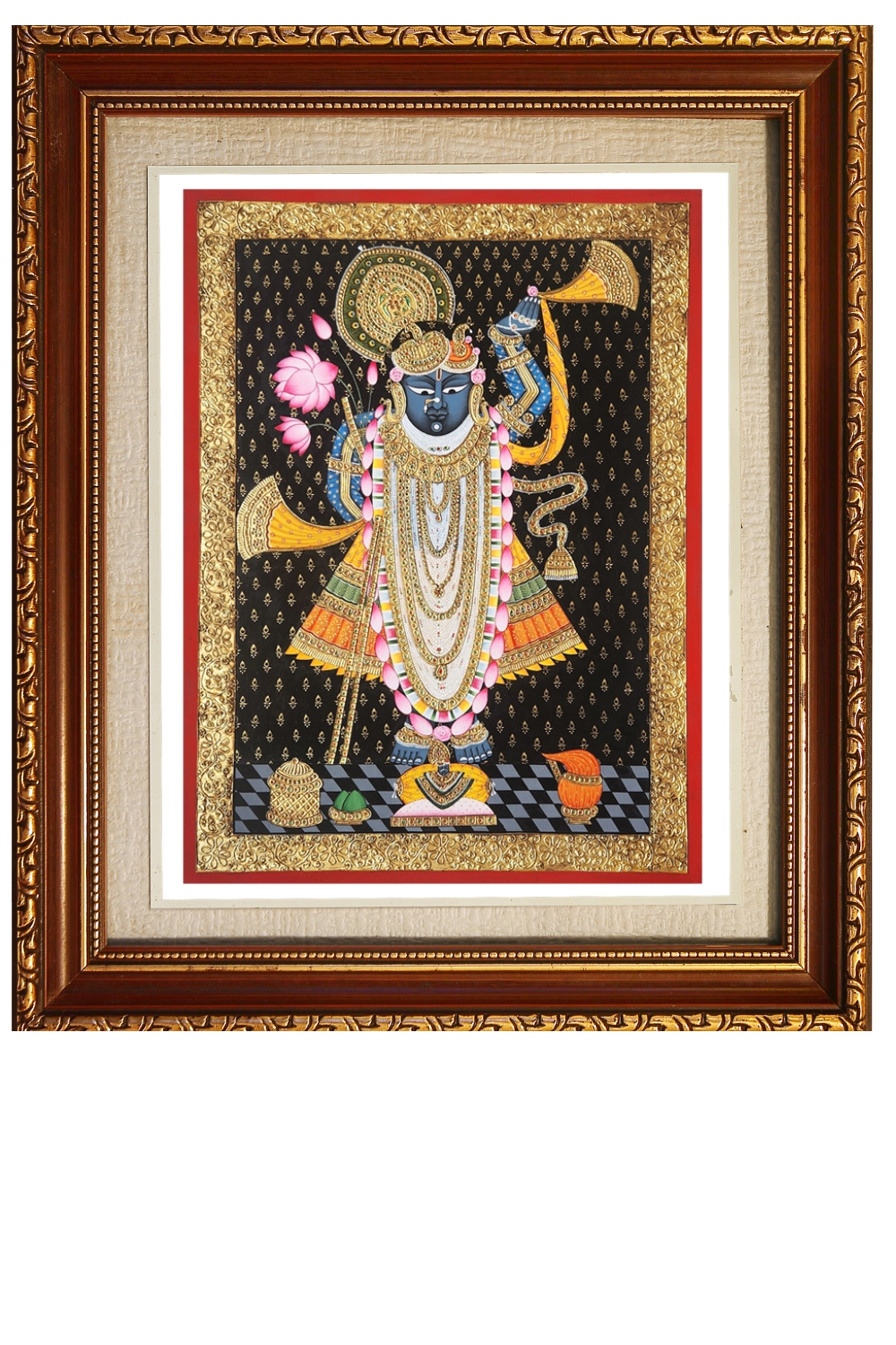 This Tanjore painting beautifully represents Shree Nath Ji, crafted with intricate detailing and authentic real gold work. The rich textures and vibrant colors reflect the traditional heritage of Tanjore art, bringing an aura of spirituality and devotion to any space. Handcrafted with meticulous attention to detail, this masterpiece is a perfect addition for collectors of sacred art and devotees alike. Frame not included in price, allowing you to choose a style that complements your decor.