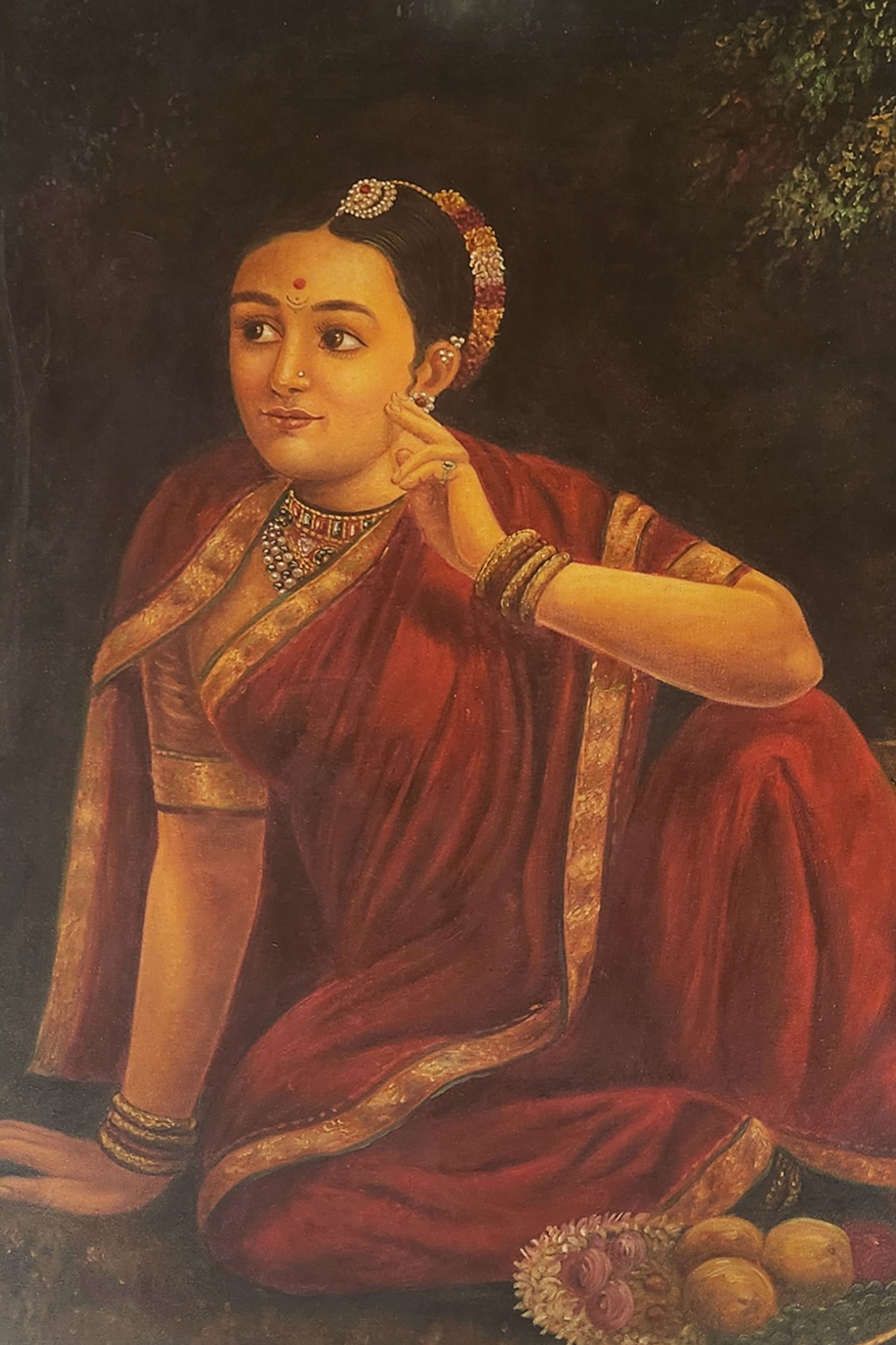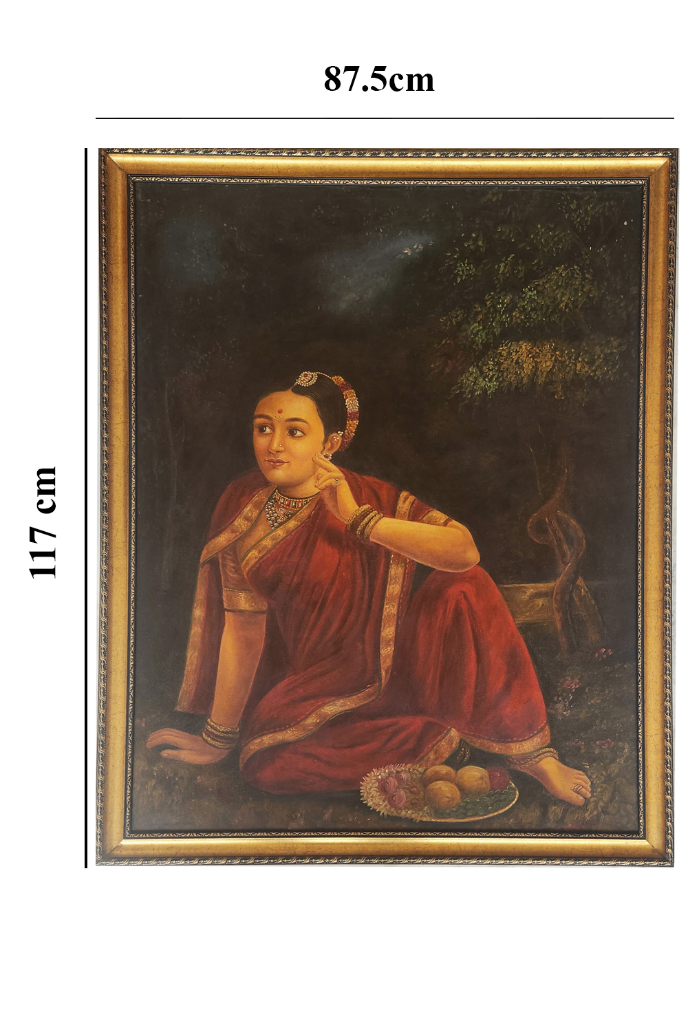 This exquisite oil painting captures the serene grace of a lady seated in quiet contemplation, wearing a traditional saree and delicate jewellery. The intricate detailing of her attire and adornments reflects the elegance of classical artistry. The soft tones and refined brushwork make this artwork a stunning centrepiece for any space, invoking a sense of calm and beauty.