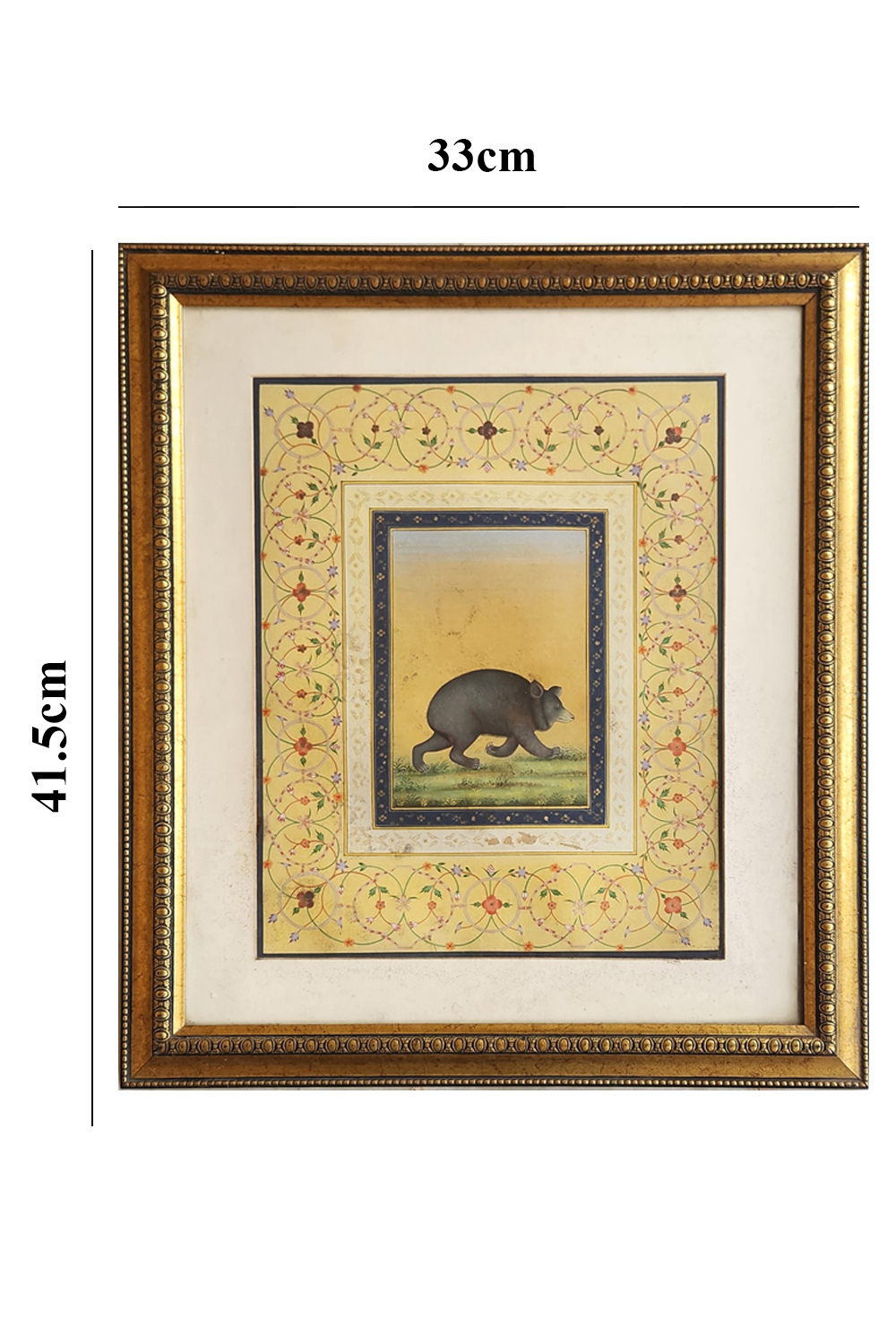 This exquisite miniature painting showcases a bear walking on a grassy patch against a yellow background. The painting is framed by a series of ornate borders featuring intricate floral and geometric patterns. Key features include: