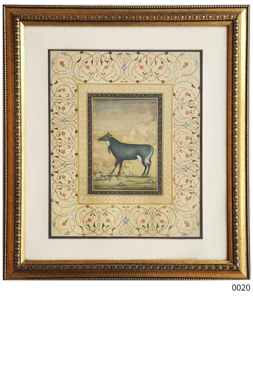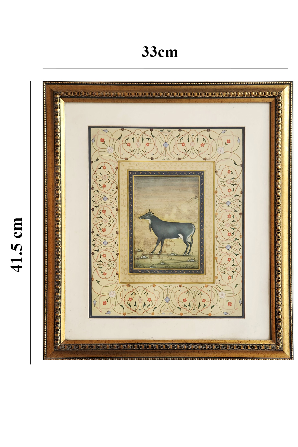 This exquisite Mughal miniature painting features a Nilgai, an Indian antelope, standing gracefully in a serene landscape. The painting is surrounded by an ornate border with intricate floral and vine patterns, characteristic of Mughal art. The Nilgai is depicted with a realistic yet stylized approach, showcasing the artist's attention to detail. The background is subtly textured, providing depth and context without overwhelming the central figure. The use of muted colors and fine brushwork highlights the elegance and sophistication of the Mughal artistic tradition.