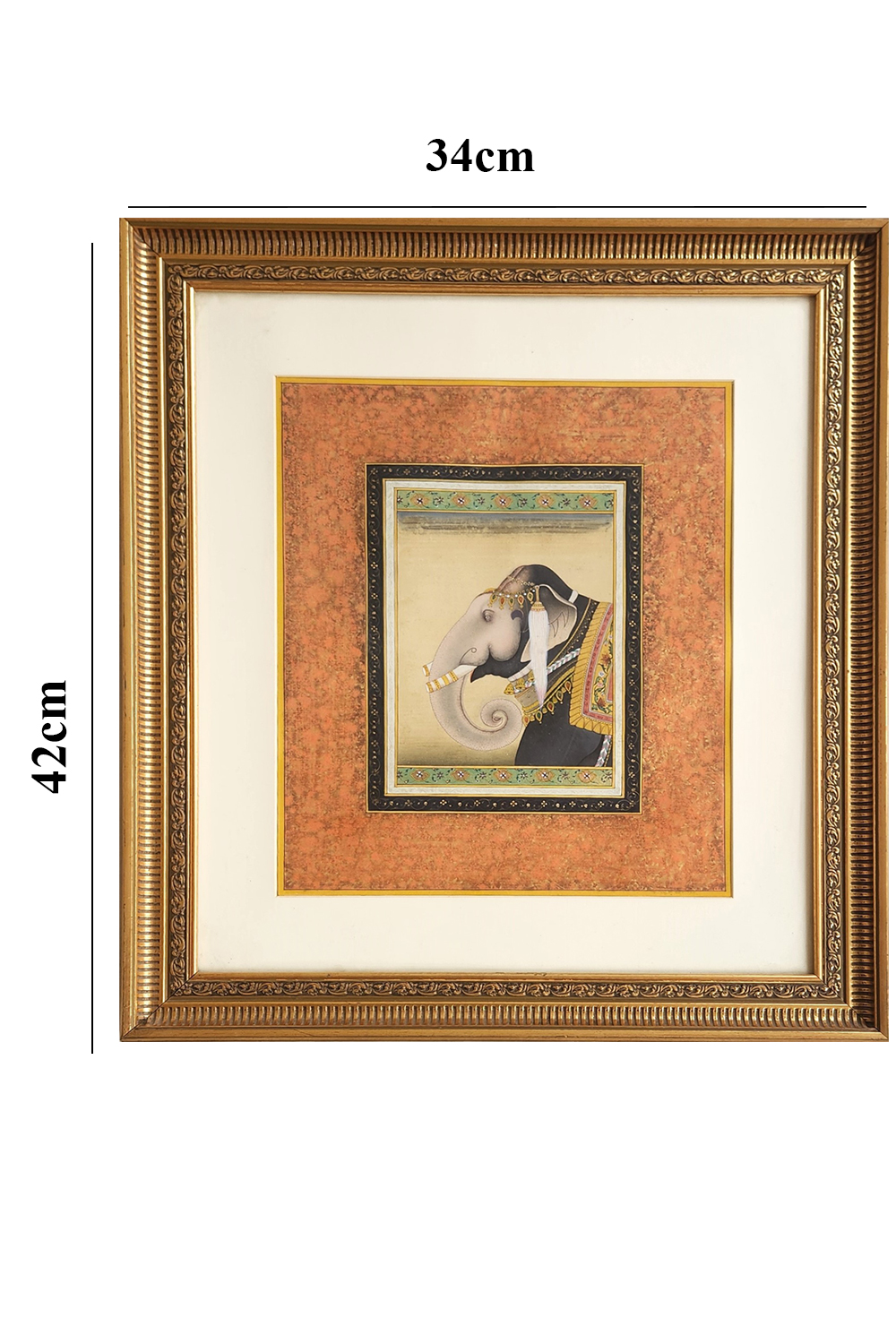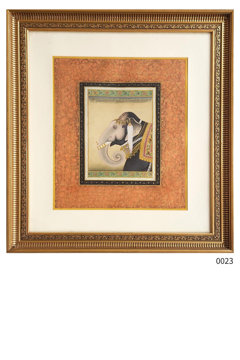 This exquisite miniature painting captures the grandeur of a regal elephant adorned with intricate ornaments and a richly decorated saddle cloth, set against an ornate background. The painting is framed with detailed floral borders, enhancing its elegance and traditional appeal. Key features include: