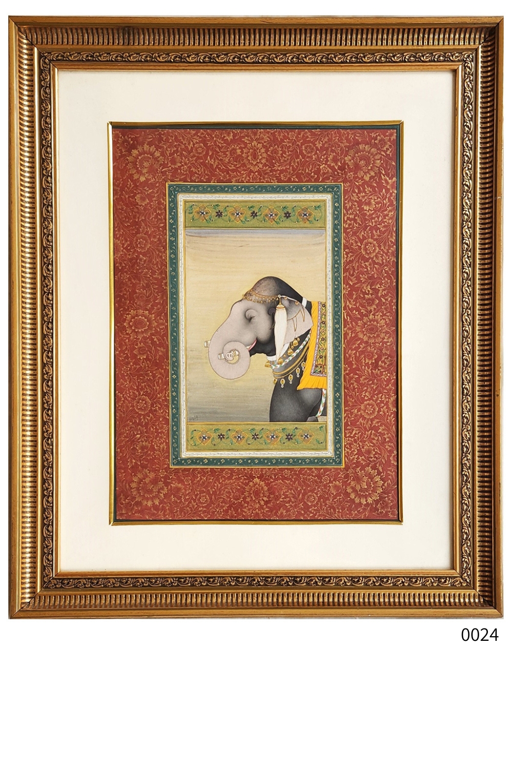 This exquisite miniature painting depicts a regal elephant adorned in traditional attire, showcasing the rich cultural heritage and artistic finesse of the region. The painting is characterized by: